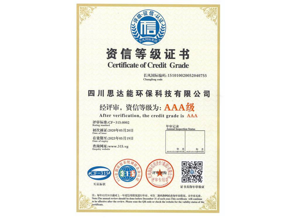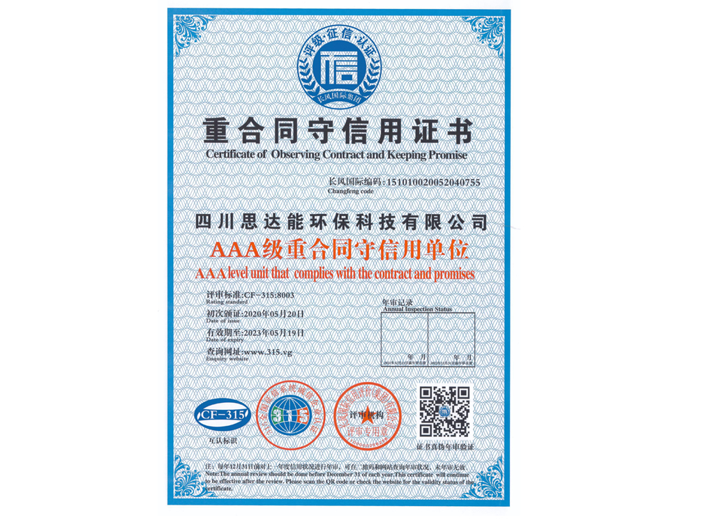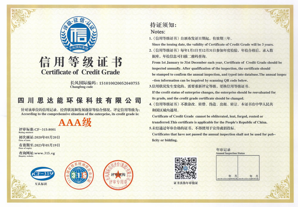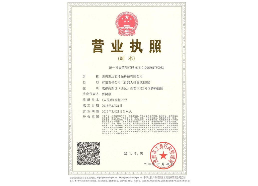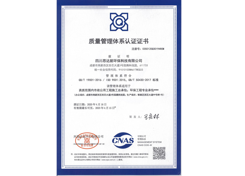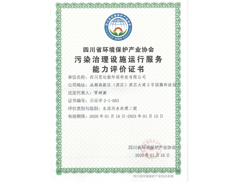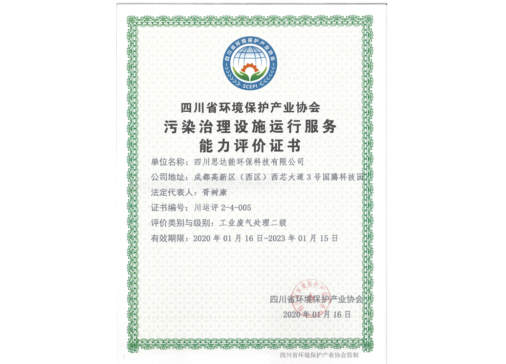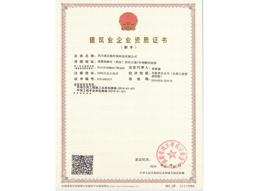 The company has two general contracting qualifications: Grade III General Contracting of municipal public works construction and grade III professional contracting of environmental protection works. Three class A qualifications: air pollution control, water pollution control and environmental protection equipment manufacturing. Three class B qualifications: comprehensive utilization of resources, noise and vibration, and solid waste treatment and disposal. The company has the evaluation certificate of the operation service capacity of pollution control facilities, "industrial waste gas treatment class II", "industrial wastewater treatment class II", "domestic sewage treatment class II" and "dust removal, desulfurization and denitration class II".